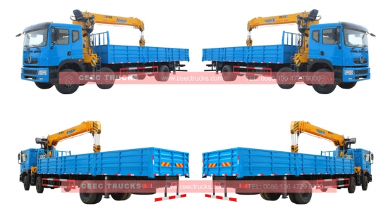 Dongfeng Telescopic model 12T boom crane trucks for sale, LHD and RHD model optional, CUMMINS heavy type diesel engine 260HP, Manual 8-shift gearbox for hot sale. Equipped with 12 Tons telescopic boom crane. Customer required Cargo box model with length can be long as 8000mm, With Remote Control for customer choose