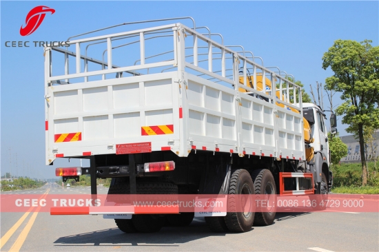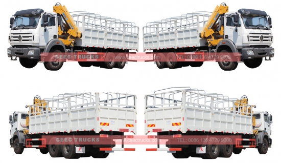 Beiben 5 Tons knuckle boom crane trucks for sale, super WEICHAI diesel engine 380HP, FAST9-shift gearbox as standard, with Left hand drive and Right hand drive model for optional. Equipped with 5Tons knuckle boom crane and special design cargo box, crane maximum lifting weight can be 5000kg. With Remote Control for customer choose