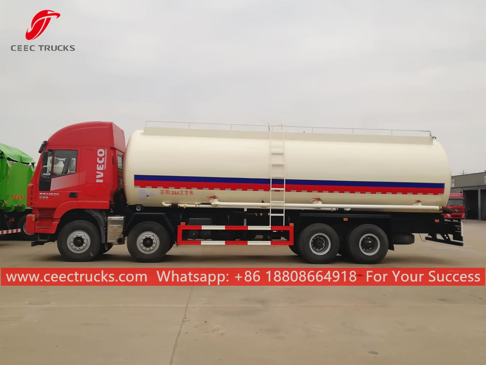 8X4 Powder Transportation Truck IVECO (36,400 L) General Vehicle Brand CEEC TRUCKS Chassis Brand IVECO Overall Dimension 11990 * 2525 * 3950 mm GVW / Kerb Weight 31,000kg / 17,000kg Cab Cab Capacity 3 persons allowed Air Conditioner Heating/cooling air conditioner Engine Fuel Type Diesel Engine Brand SFH Power 390 HP (287 KW) Displacement 8709 ml Emission Standard Euro 4 or 5 Chassis Drive Type 8X4 (left hand drive) Transmission FAST 12 speed levers with 2 reverse Wheelbase/No. of axle 1800+4600+1400 mm / 3 Tire Specification 12.00R20 Tire Number 12 tires and 1 spare tire Max Speed 90 km/h Paint Metallic paint Superstructure Tank capacity 36,400 Litres Tank Material Carbon Steel Pneumatic Equipment Fuel pump equipped for overhead