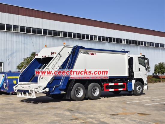 Isuzu VC61 6x4 cabin,large capacity garbage binThis Isuzu GIGA 6x4 heavy-duty garbage truck is an outstanding work in the field of sanitation engineering and a strategic weapon for urban cleaning.Equipped with a 6UZ1-TCG61 engine, it has a powerful output of 380 horsepower, a displacement of 9.839L, and turbocharging and intercooling technology. It is not only powerful, but also meets the stringent Euro 6 emission standards. Its 25-ton total weight configuration and 12.7-ton load capacity can fully meet the daily garbage removal needs of large and medium-sized cities.