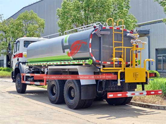 So the water tanker is based on Beiben 6x6 all-drive chassis, with all wheels providing driving force, significantly improves traction and climbing ability on low-grip surfaces (mud, snow, sand, and ice), preventing slippage and sinking. Beiben off-road chassis typically offer high ground clearance, allowing them to easily navigate obstacles on rough roads (such as large rocks, deep ruts, and fallen trees), reducing the risk of bottoming out and protecting the chassis and lower tank. Multi-leaf spring or hydro-pneumatic suspension is often used, providing increased load capacity and excellent impact resistance, allowing them to withstand the harsh jolts of unpaved roads and protect the vehicle structure and tank equipment. The large approach/departure angles are designed to make it easier to go up and down steep slopes and through humpback roads, avoiding collisions between the front and rear bumpers.