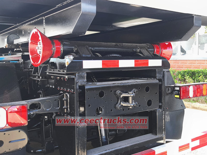 ● The hook arm first extends forward and hooks onto the front hook of the garbage bin. The hydraulic cylinder then retracts, driving the hook arm slowly upward, smoothly pulling the garbage bin along the guide rails to the vehicle's carriage.