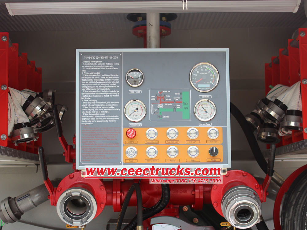 Water pump operation panel in English, fender should be black, with alarm light, detachable ladder, body rear equipment box under the direction of the upward tilt of about 45 degrees, all interfaces of the vehicle and accessories are British, with a 30m roll of black high-pressure hose |