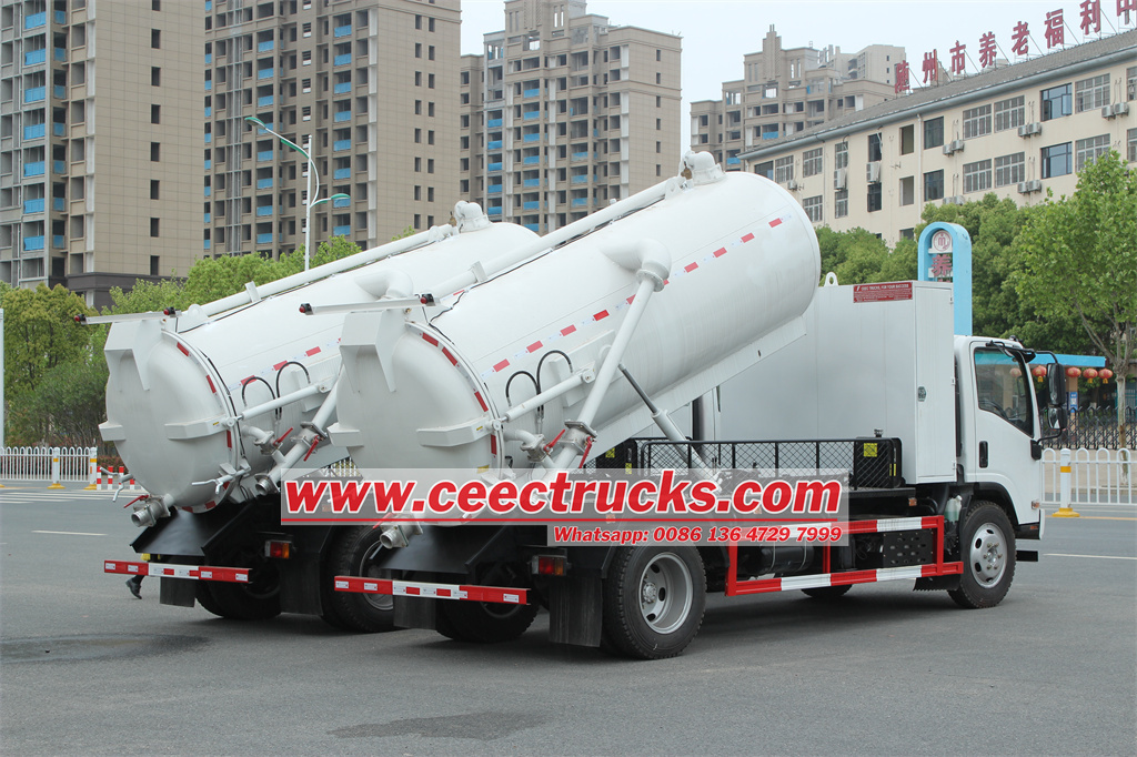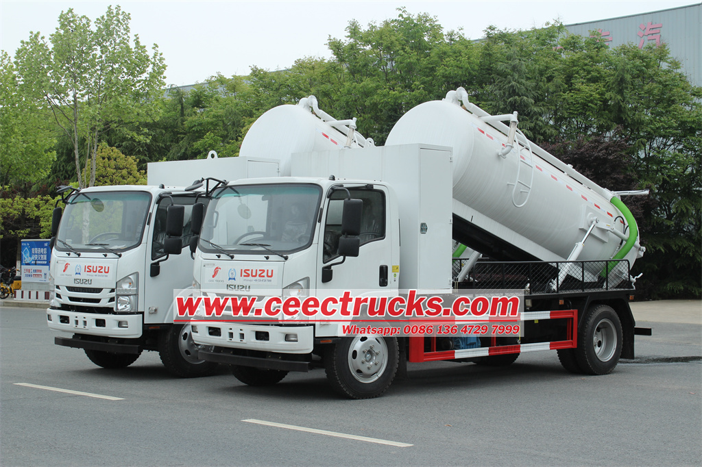 ISUZU 700P vacuum sewage suction truck is a special vehicle based on the ISUZU 700P NPR NQR 4x2 chassis, which also can be customized as 4x4 offroad. Isuzu sewer trucks are mainly used for the suction, transportation and discharge of sewer sludge. However, an overview of the ISUZU 700P vacuum sewage truck and its possible MORO PM70A components can be made based on known information: