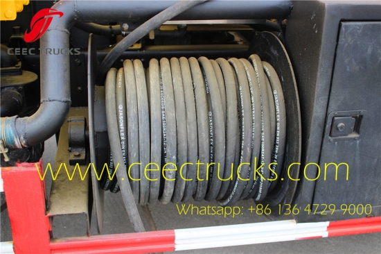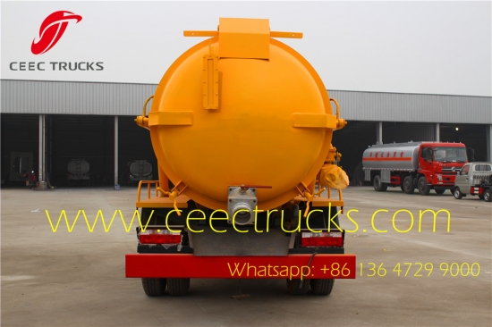 3.Equipments: round tank with material of carbon steel, high-power vacuum pump, dump body, back cover can be opened by hydraulic, back cover equipped with self-flowing hole and special valve, suction height can be 5-8 meter, equipped with special sewage suction pipe;