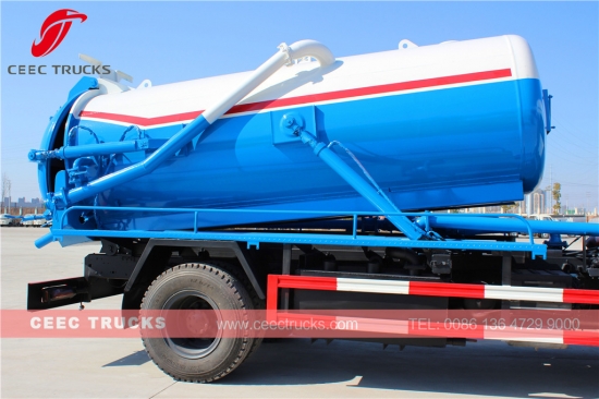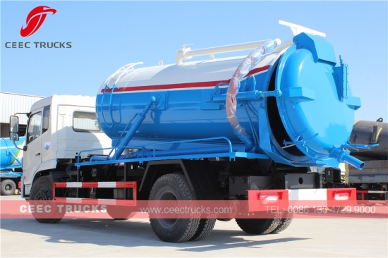 Dongfeng 10000L cesspit emptier, CUMMINS 170HP diesel engine, 6-shift manual gearbox, high strength steel material tanker can be up to 10 cbm, WEILONG vacuum pump, hydraulic lifting device for waste discharge, painting and logos depend on request.