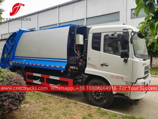 Dongfeng 10cbm garbage compressing truck, the truck chassis use CUMMINS 180HP diesel engine, 8-shift transmission gear. Siemens technology PLC control box for easy operation. All painting and logos depend on clients requirement.