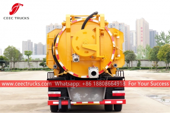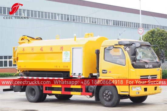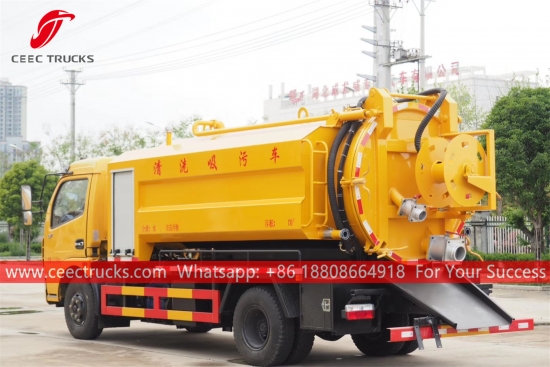 Combined Jetting Suction Truck Dongfeng (also called Combined vacuum jeting truck, suction jet truck, combination sewer cleaning truck, combined jetting suction vehicle, jetting and vacuum truck, vacuum sewage jetting combined truck , combined jetting and suction truck ) is a vehicle that is designed to clear any blockage with jetting nozzles moving in sewage pipeline under high pressure, and clear sewer drain lines by means of a powerful vacuum suction to suck all water plus mud from sewer hole. This truck is widely used for environmental protection.