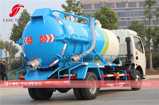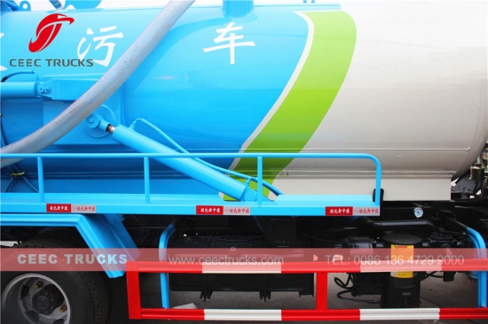 Dongfeng 8000L cesspit emptier, CHAOCHAI 120HP diesel engine, 5-shift manual gearbox, high strength steel material tanker can be up to 8cbm, WEILONG vacuum pump as standard, hydraulic lifting device for waste discharge, painting and logos depend on request.