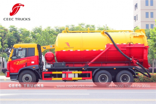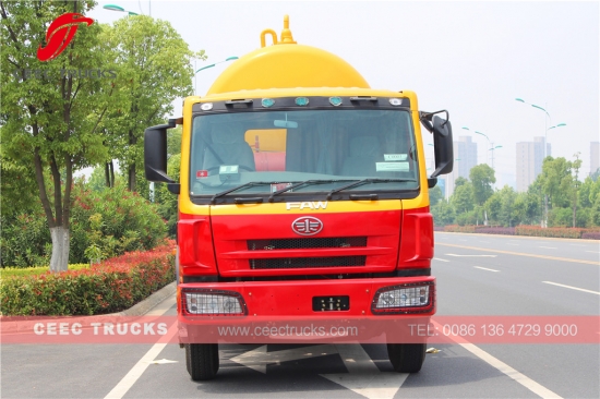 FAW 18000L vacuum suction truck, which use FAW brand 220HP diesel engine, Manual 9-shift transmission gearbox, high strength steel material tanker can be up to 18cbm, WEILONG vacuum pump as standard, hydraulic lifting device for tank rising, painting and logos depend on request.
