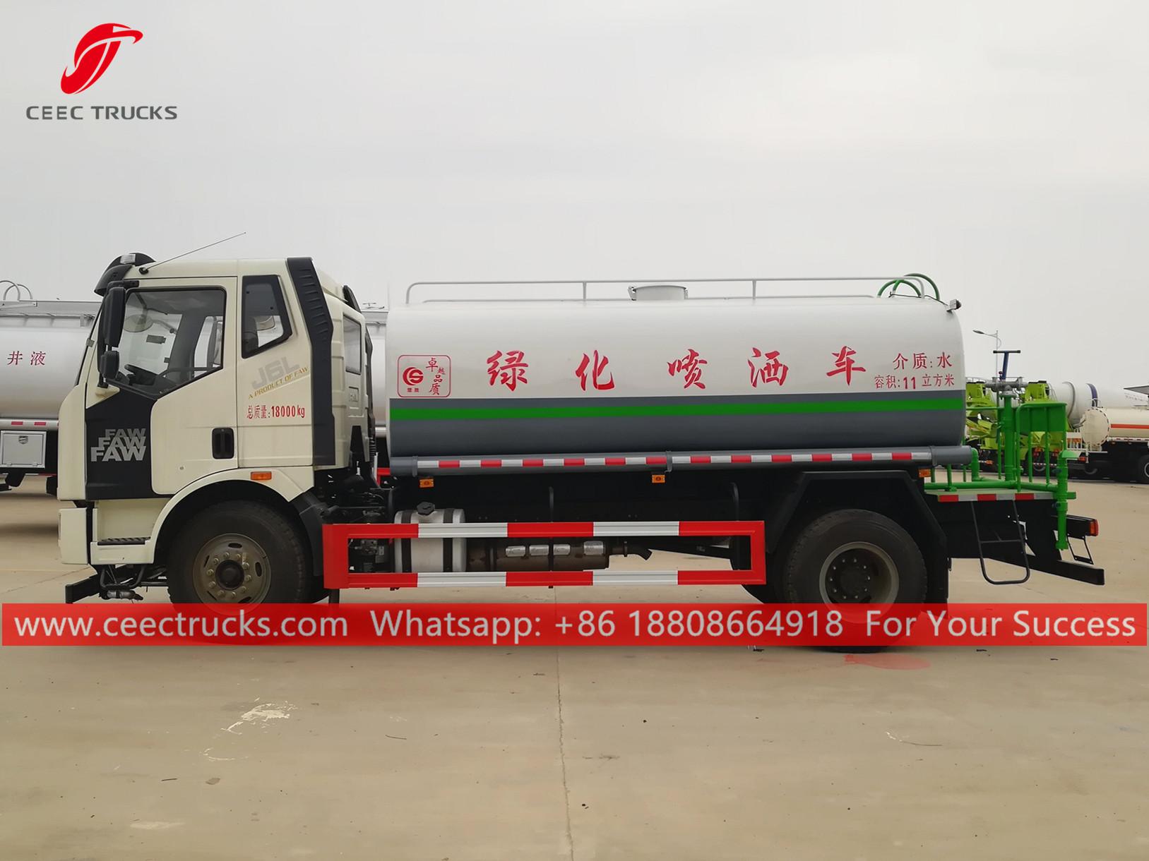 FAW 11,000L water bowser truck, FAW 4x2 left hand drive chassis, 6-shift manual gearbox, FAW 224HP diesel engine, famous brand water pump, with front, middle and rear spraying nozzle optional. All painting and logos depend on requirement.
