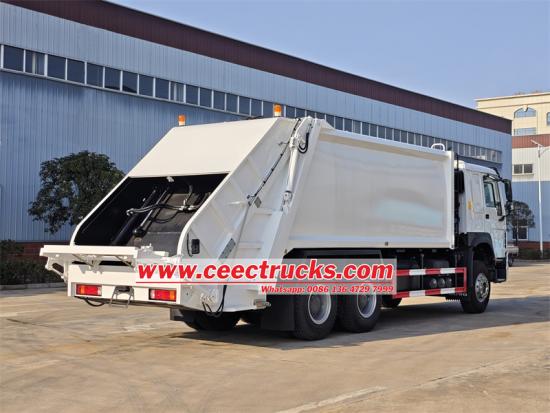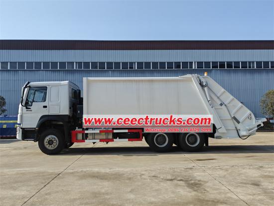 HOWO 6x4 20cbm rear loader compactor truck is used for municipal sanitation,which is modified on HOWO 6x4 4,600+1,350mm wheelbase chassis,with WP10.340 340HP engine, Inline 6-cylinder, four-stroke, supercharged and inter-cooled, 9.726L displacement,HW19710 10 speed gearbox,A/C,USB,direction assistance.The truck garbage bin has a 20cbm capacity for compressing more trash.