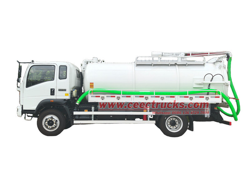 Howo 5,000 liters single axle septic truck(also called Howo 5cbm vacuum suction pump truck, Howo 5,000 liters vacuum tanker truck, Howo 4x2 septic tank pump truck, Howo 6 wheels septic pump tanker, Howo vacuum sewage suction truck.) is used to collect, transport and discharge liquid such as dirty water,sludge,septic.The tank body has been treated with anti-corrosion and anti-rust treatment and is extremely durable. Combined with a high-power vacuum pump, it has strong suction and is an indispensable professional equipment in urban and rural environmental governance.