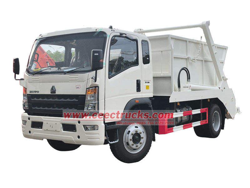 The HOWO 6cbm skip loader refuse truck is also called a HOWO swing arm garbage truck, Howo 6-wheel waste collection truck, Howo skip bin loader, or Howo swing arm garbage collection truck.