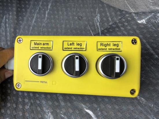 Extending and retracting the outrigger cylinders extends and retracts the support legs, stabilizing the truck.