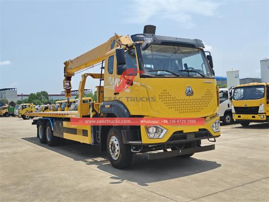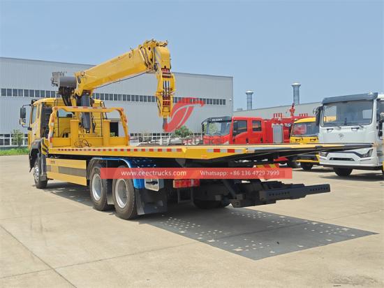 6X6, LHD/RHD drive type avaiableThis Howo flatbed tow truck with 8T crane is a versatile and well-designed special truck. It is equipped with a diesel engine of Chinese brand Yuchai Engine, with a strong power of 260HP, which can meet various work needs. The new M9 luxury cab can accommodate three people and is equipped with air conditioning, providing a comfortable driving environment for drivers and operators. The crane is a telescopic boom with a maximum lifting capacity of 8000kg, 360° full rotation, and a maximum lifting height of 16.5m. The crane designed by CEEC factory weighs 1850kg and has an installation space of 1350mm, which is light and space-constrained. At the same time, the crane truck combines the flatbed tow system, with a load capacity of 12-15tons, providing more possibilities for engineering operations. The control panel can be selected in English or other languages, which is convenient for users with different needs. Howo cargo crane truck also provides a variety of optional configurations, such as folding arm boom, hydraulic dump box, customized box thickness and height according to needs, and optional remote control box.