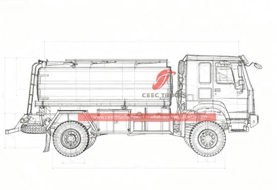 The Howo off road 10000L mobile fuel bowser is the mining special refueling tank truck. The Howo fuel tanker using 4X4 drive system and it’s equipped with a WP10.290E40 model 6-cylinder in-line water-cooled turbocharged intercooled diesel engine with a maximum output of 290HP. The gearbox is 10 front speeds and 2 rear speed, equipped with a reinforced diaphragm clutch. The Howo fuel tnaker has strong power and good controllability, suitable for various road conditions oil transportation work.