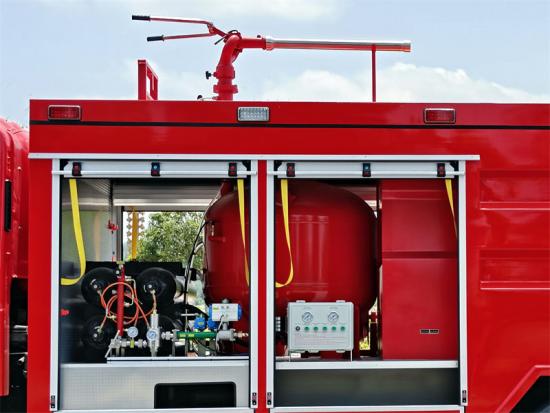 This is a dry powder nitrogen fire truck built on Howo TX Chassis. It is equipped with a powerful Weichai 340HP engine with a displacement of 9.839L. It adopts a 6X4 drive mode and is equipped with a 10-speed gearbox. The maximum speed can reach 95km/h, which can adapt to various complex road conditions. In terms of the fire protection system, the vehicle is equipped with 700kg carbon steel dry powder storage tanks and 6units 80-liter nitrogen cylinders with a design pressure of 15MPa.