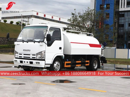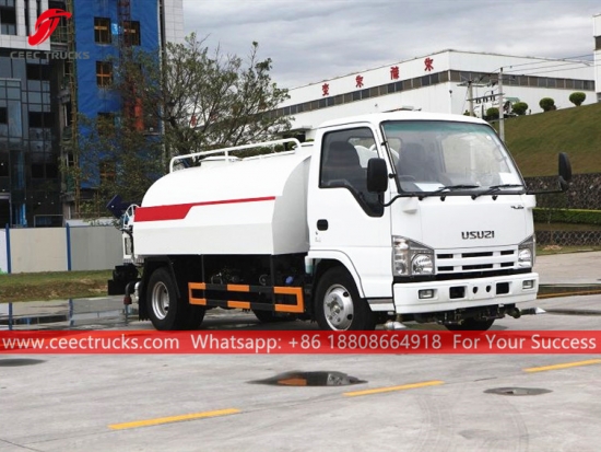 ISUZU 4,000L water bowser truck, ISUZU 4*2 left hand drive chassis, MSB 5-shift manual gearbox, ISUZU 98HP diesel engine, famous brand water pump, with front, middle and rear spraying nozzle optional. All painting and logos depend on requirement.