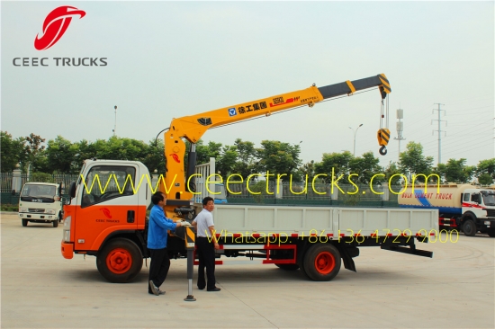 ISUZU 5 T boom crane mounted truck also named ISUZU telescopic 5 T truck mounted crane, XCMG truck crane supplier. which has 3 level telescpoic crane arms, I-shape hydraulic lifting legs for safety support. Our 2016 newly produced ISUZU 5 T truck mounted crane being widely export Kenya Mombasa, Congo Pointe Noire, and being used for heavy thing lifting and transportation.