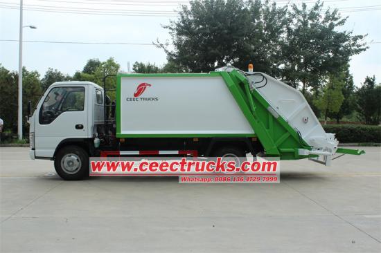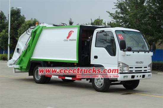ISUZU 5 cubic meters compressor garbage truck is a specially designed garbage collection, compression and transfer vehicle. ISUZU 5cbm rear loader garbage truck is a compression garbage truck with ISUZU brand mini ELF 4x2 left hand drive chassis and a compartment body volume of 5 cubic meters. This Isuzu rear loader compresses the garbage through a compression mechanism to reduce the volume of the garbage, thereby increasing the loading capacity and transportation efficiency of the garbage.