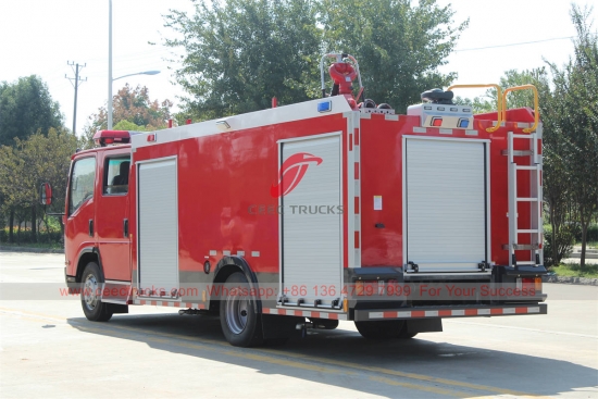 ISUZU ELF water foam fire truck, ISUZU ELF Left Hand Drive model 4x2 chassis, MLD 6-speed manual gearbox, ISUZU 190HP diesel engine, painting and logos depend on requirement.
