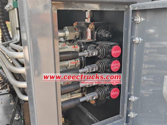 Electric control in the cab: The driver can directly control the tailgate lifting, loading and unloading mode, tailgate cleaning, and push and pull of the push shovel through the electric control panel in the comfortable cab, which improves the convenience and safety of operation.