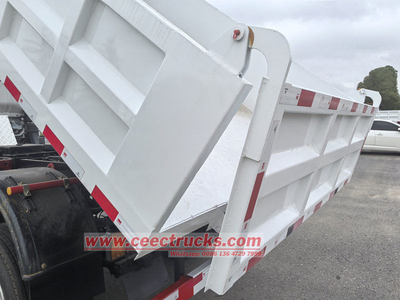 The Isuzu 4x4 drive dumper truck is modified on the basis of Isuzu ELF NPR all-wheel drive chassis, with a wheelbase of 3815mm, equipped with Isuzu 190HP 4HK1-TCG61 diesel engine, Isuzu MLD-6 speed gearbox, and a dump box made of carbon steel with three sides and four bottoms, 4200×2200×550mm, central lifting, stable lifting, clean and quick unloading, rear doors can be opened, and the vehicle is controlled by the control valve on the driver's side, which is easy to operate.