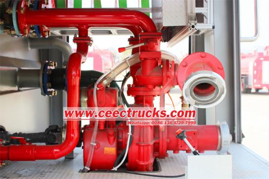 3. Humanized design: The cab can accommodate 2+4 people and is equipped with an air-conditioning system to ensure that firefighters remain comfortable during long-term operations. The body adopts high-strength rectangular steel pipe and aluminum alloy welded structure, which not only ensures strength but also reduces weight. The roof is equipped with LED lighting and handrails, and an aluminum alloy ladder is installed at the rear to facilitate firefighters to quickly climb to the top for operation. LED lighting is installed on both sides and the top of the car to ensure the field of vision for night operations. These designs fully consider the actual needs of firefighters and improve work efficiency and safety.