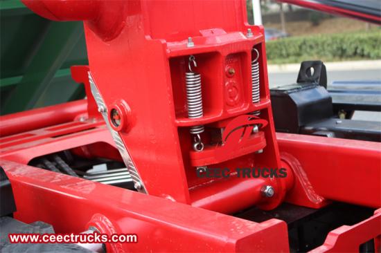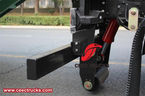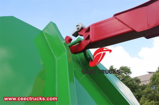 Step 3. When the arm hook is hooked to the box body hook, continue to push the arm operating handle down to the dropped position to allow the garbage box to continue to load the vehicle (Note: Make sure that the longitudinal beam of the garbage box is located between the two rear rollers at the tail of the attached frame);