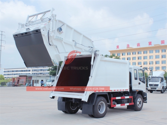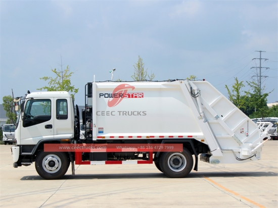 ISUZU FTR 10cbm garbage compactor truck (also called garbage compactor, ISUZU refuse compression truck, factory direct sale waste compactor truck, ISUZU rear load refuse collection truck, ISUZU back loading bin lorry, refuse compactor manufacturer in China) is designed for daily rubbish transport in such living areas as all kinds of cities, large station, port and wharf, airport, and densely-populated areas like industrial and mineral enterprises and military units.FTR garbage compactor can efficiently collect and compact large volumes of garbage or waste into a more condensed form to reduce the number of trips to disposal sites, optimize storage capacity, and minimize transportation costs.