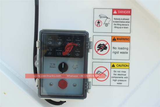 ** Back alarm and Camera can be equipped. ** Italy mulit-valve can be choose. ** 240L (single bin or double bin) or standard 660 L, 1100 L bins with bin lifter can be choose. |