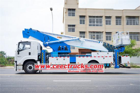 The ISUZU FTR 45m Bucket Lift Truck is a high-performance aerial work platform equipped with an ISUZU 4HK1-TCG60 engine, boasting a power output of 151KW and a working height of 45 meters. It features a seven-section hexadecagonal telescoping boom and a front V-shaped plus rear V-shaped three-section outrigger design, ensuring stable operation. The cabin is spacious and comfortable, equipped with multifunctional facilities. The comprehensive safety design includes cylinder retraction prevention, emergency stop, and other devices. It is widely used in construction, electricity, telecommunications, and other fields, providing efficient, safe, and reliable solutions.