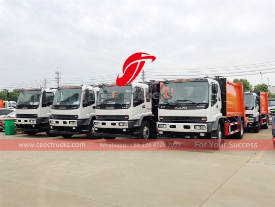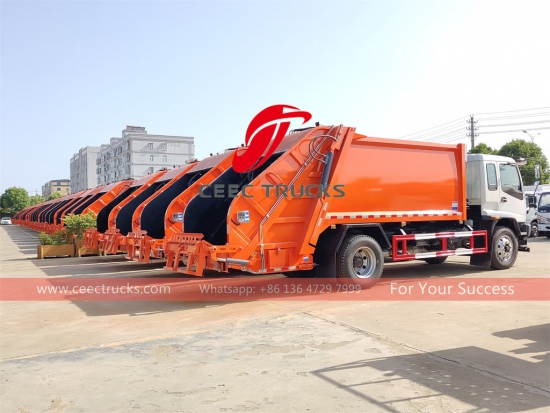 ISUZU FVR 10cbm garbage compactor truck (also called garbage compactor, ISUZU refuse compression truck, factory direct sale waste compactor truck, ISUZU rear load refuse collection truck, ISUZU back loading bin lorry, refuse compactor manufacturer in China) is designed for daily rubbish transport in such living areas as all kinds of cities, large station, port and wharf, airport, and densely-populated areas like industrial and mineral enterprises and military units.