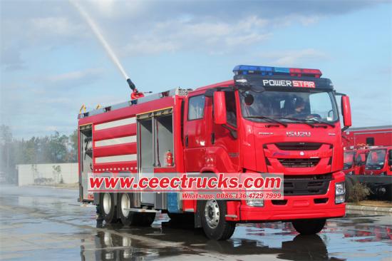 10cbm water tank,1.5cbm foam tankThis ISUZU GIGA fire tanker is a perfect combination of powerful performance, exquisite craftsmanship and practical application advantages. This Isuzu fire fighting truck is equipped with Isuzu's powerful 6WG1-TCG60 engine, and its output of 420 horsepower is enough to cope with various emergencies. Its maximum speed can reach 95 km/h, ensuring that firefighters can reach the fire scene quickly. The firefighting capacity of the ISUZU GIGA fire tanker - 60 liters/second pumping flow and 65 meters of range are sufficient to cope with most fires. The 8000-liter water tank capacity and 1500-liter foam tank provide sufficient guarantee for continuous combat. The chassis made of high-strength special steel ensures the stability of the vehicle structure. The equipment compartment made of aluminum alloy is not only lightweight, but also never rusts, greatly extending its service life. The liquid tank made of PP composite material is both light and durable. Every detail shows exquisite craftsmanship, from the rolling shutter door with rain gutter design to the pedal with anti-slip design, all of which reflect the thoughtful consideration of firefighters' safety and convenience.