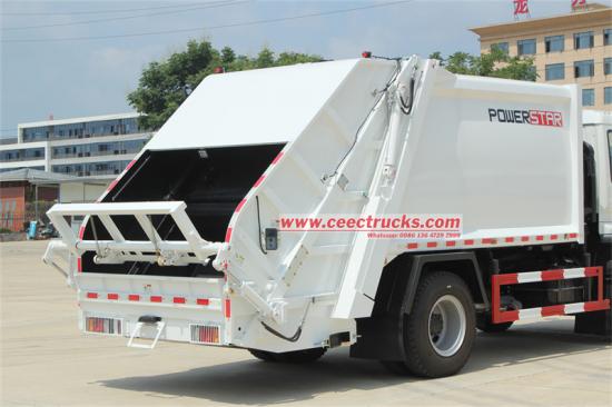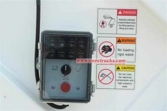 Fully sealed loading hooperThis is an Isuzu rear load trash truck with excellent performance, equipped with a 4HK1-TC50 205 horsepower engine, a top speed of 90 km/h, and a 6 forward and 1 reverse gearbox. The garbage bin has a capacity of 12 cubic meters and is made of 4mm carbon steel. It has an anti-leakage design, rear-loading loading, and an optional barrel-type lifting system. The garbage compactor ratio is 1/3 - 1/4, and there is a control system at the rear of the vehicle and the rear of the cab.