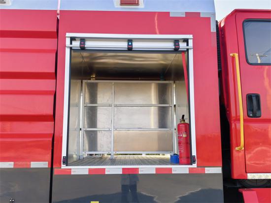 Tank System: The front part is the equipment room, where various firefighting equipment (such as fire hoses, fire extinguishers, fire axes, wrenches, hammers, picks, etc.) are stored for easy access. In the middle, there is a 9-cubic-meter carbon steel water tank and a 3-cubic-meter foam tank, both equipped with manholes on top.