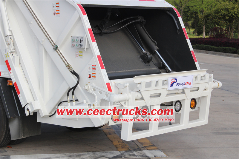 The ISUZU Garbage Compactor Truck makes use of the special power take off (PTO) to get power from the engine, and then transfer the power to the Gear Pump so to rotate the pump. The pump start working to transfer hydraulic oil to cylinders through pipelines, and cylinders working to make all garbage trucks equipment working, including tailgate, push plate, slide plate, scraper and tilting device. And then realize all function of the garbage compactor truck.