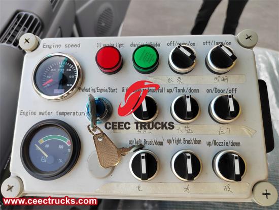 Isuzu100P 5.5 cubic meter road sweeper is equipped with an advanced control system, including various instruments and buttons in the cab, the road sweeper work operation box and the box operation control box under the tail of the box. The driver can easily control the vehicle's driving, sweeping, watering, vacuuming and other actions through the control system.