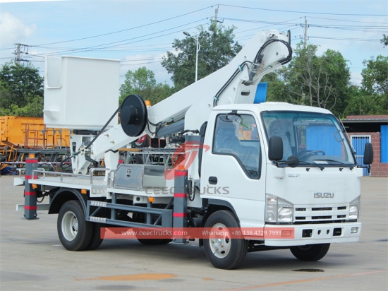 16m bucket crane lifting truck, ISUZU 100P 4x2 chassis, 5-shift manual gearbox, ISUZU 98HP diesel engine, painting and logos depend on requirement. Customer language control box.