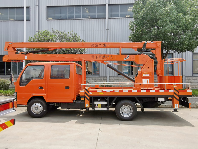ISUZU 16m double cabin 120HP aerial platform truck belongs to the folding arm aerial work vehicle. Compared with the straight arm or scissor type, it has higher flexibility and is suitable for narrow space operations. The maximum operating height is 16 meters, and the span height is about 7.5 meters, which can be equipped with insulated basket cover the needs of urban construction, bridge maintenance, power installation, etc. Isuzu man basket manlift truck is equipped with hydraulic locking, limiter, and emergency braking system, some models use imported hydraulic components (such as load-sensitive proportional valves) and intelligent control systems to ensure smooth and safe operation.