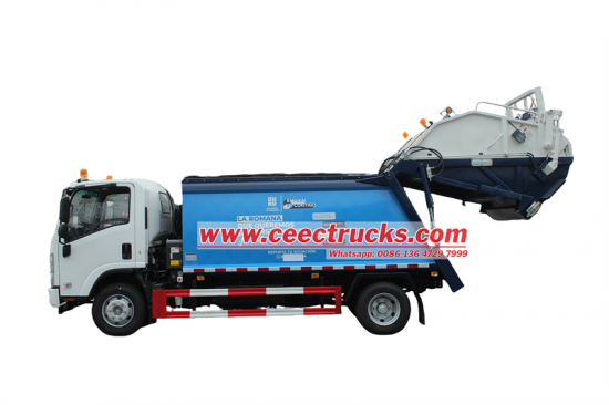 10cbm garbage bin,with 4 operation methodsIsuzu NPR rear loader compactor truck is equipped with a 4HK1-TCG61 diesel engine with a maximum power of 189 horsepower/139kW and a peak torque of 507Nm. It is matched with a 6-speed manual transmission ISUZU MLD, which is powerful and stable. The Isuzu NPR rear loader compactor truck bin is made of high-tensile steel. Key parts such as the floor (4mm) and side panels (3mm) are reinforced by laser/plasma cutting and automated welding processes to ensure the durability of the body. With its efficient compaction, strong power, modular design and strict manufacturing standards, the Isuzu NPR rear loader truck has become an ideal solution for urban and rural garbage disposal.
