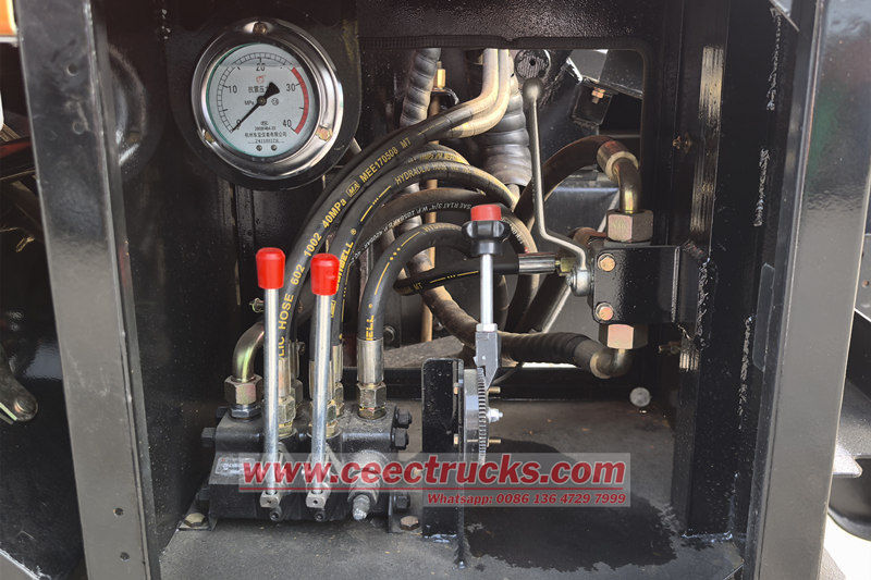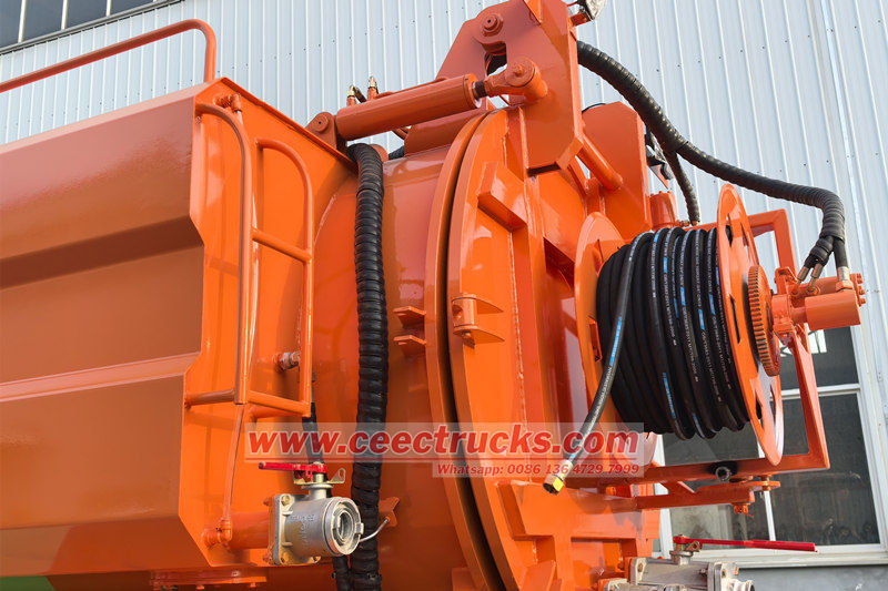 The vehicle is equipped with a high-pressure water pump to pressurize the clean water to 16-240 MPa, and cuts and flushes the stubborn blockages such as sediments, tree roots, concrete blocks on the inner wall of the pipeline through a rotating nozzle. At the same time, a vacuum pump is used to form a negative pressure in the tank body to suck the crushed sludge and sewage into the tank body through the sewage suction pipe. The hydraulic winch is used to control the extension and contraction of the high-pressure pipe throughout the operation to ensure that the operator can complete the deep pipeline dredging without going down the well.