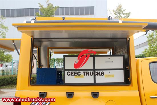 Isuzu 4x4 Pickup mobil workshop truck adopts tough body lines and wide wheel arch design, showing a strong off-road style. The body is made of high-strength steel, with excellent anti-torsion and anti-collision performance, ensuring safe operation in harsh environments. Its unique cargo box design can flexibly configure various tools and equipment according to different service needs, achieving full coverage from simple maintenance operations to complex technical support.
