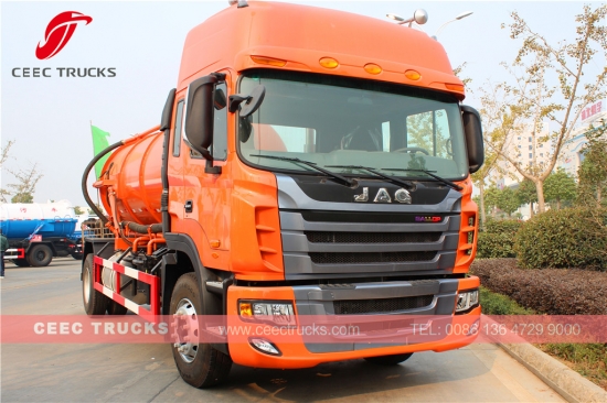 JAC brand 10000L cesspit emptier, JAC 180HP diesel engine, Manual 8-shift gearbox, carbon steel vacuum suction tanker with capacity 10 cbm, famous China brand WEILONG vacuum pump, hydraulic lifting device for waste discharge, painting and logos depend on request.