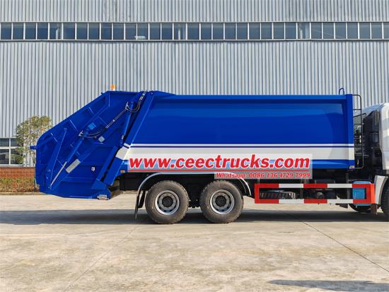 CEEC's Isuzu GIGA 6×4 rear loader compactor is equipped with an Isuzu GIGA 6x4 chassis, an Isuzu 380HP diesel engine, Euro 6 15681ml displacement, a wheelbase of 4800+1370mm/3, air brake, power steering, intercooler, 315/80R22 tires, 2 seats and 1 sleeper, air conditioning, power steering, loading capacity of 20 cbm, and a large floor-standing bucket with a fully sealed garbage bucket flipping mechanism at the tail of the garbage bin.