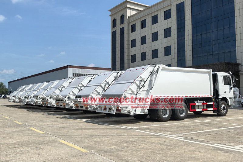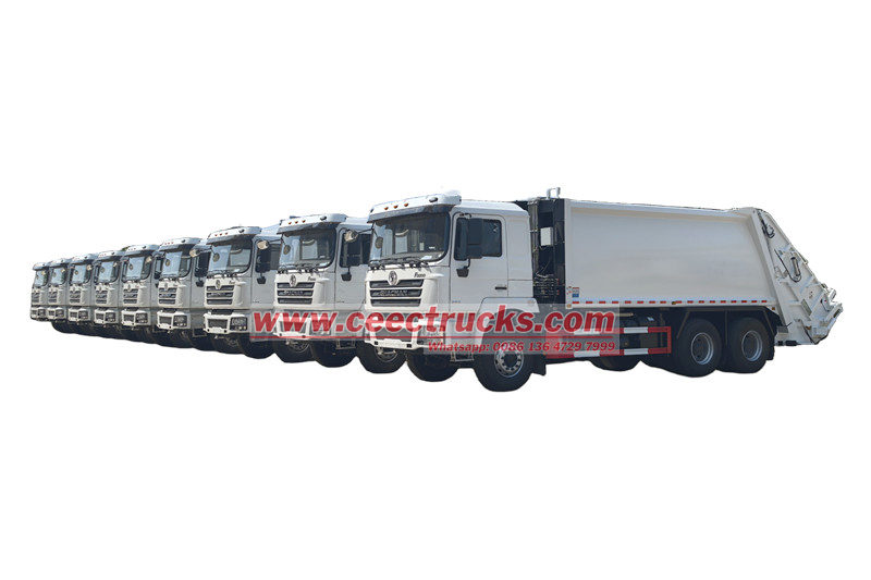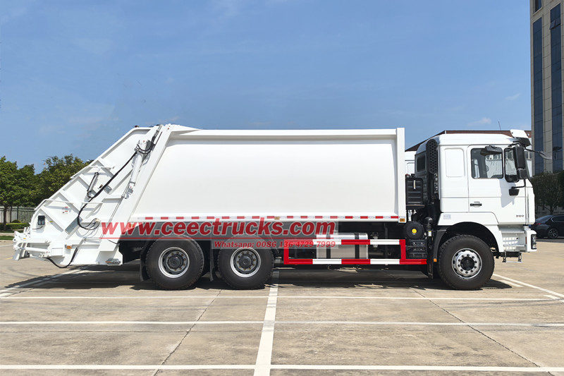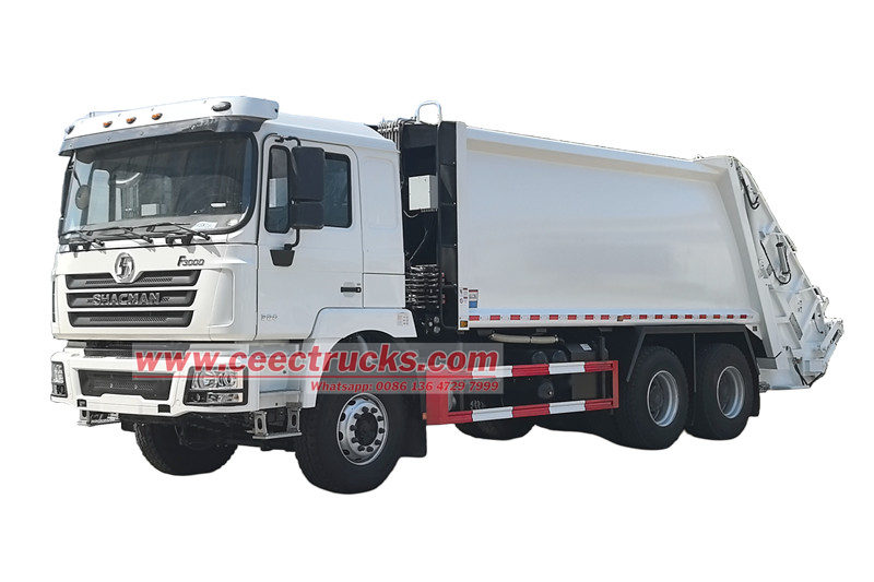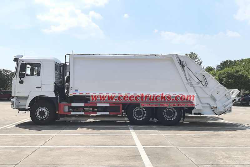 Shacman 25cbm rear loader garbage truck(also called Shacman 6x4 waste compaction truck, Shacman F3000 rear loader watse collection truck, Shacman 25cbm garbage compactor truck, Shacman split rear loader garbage truck, Shacman 10 wheels trash compactor truck) is a new type of sanitation vehicle specially used for collecting, transferring and removing garbage.
