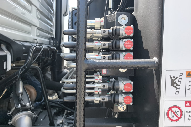 ●The Shacman rear loader compactor truck utilizes electro-hydraulic control valves and a PLC programmable control system, combining the advantages of both electronic and hydraulic control. This integrated electro-hydraulic control effectively resolves interface issues between the hydraulic and electrical systems, improving operational reliability.