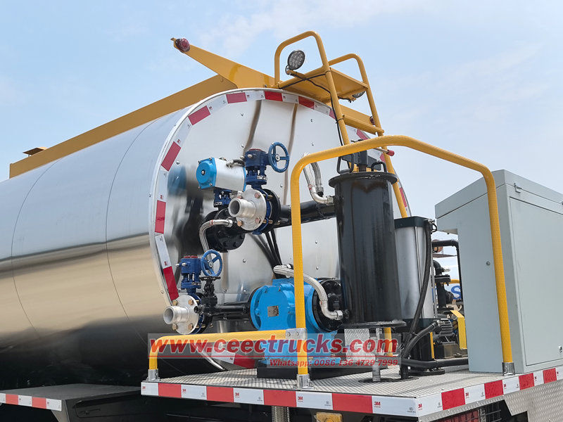 Its body is equipped with a large-capacity insulation tank, which uses high-efficiency insulation materials and an intelligent temperature control system. It can store hot asphalt or modified asphalt of different grades for a long time, ensuring stable material temperature and good fluidity.