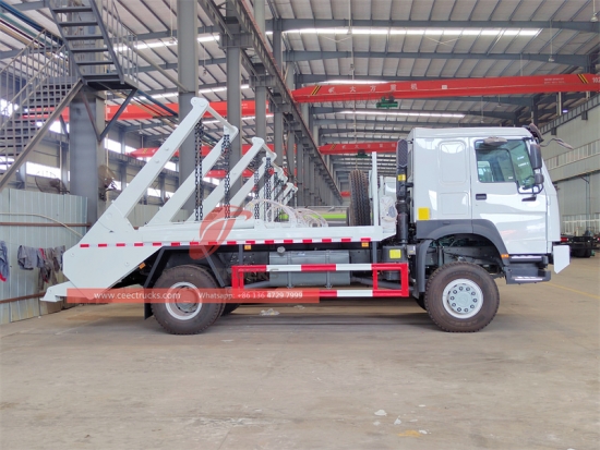 SINOTRUK 4X4 10cbm skip loader vehicle, SINOTRUK left hand drive 4x4 chassis, Manual FAST 9-shift manual gearbox, WEICHAI 290HP diesel engine, high strength steel swing arm system, Hydraulic control device and Electric control box optional, All painting and logos depend on requirement.